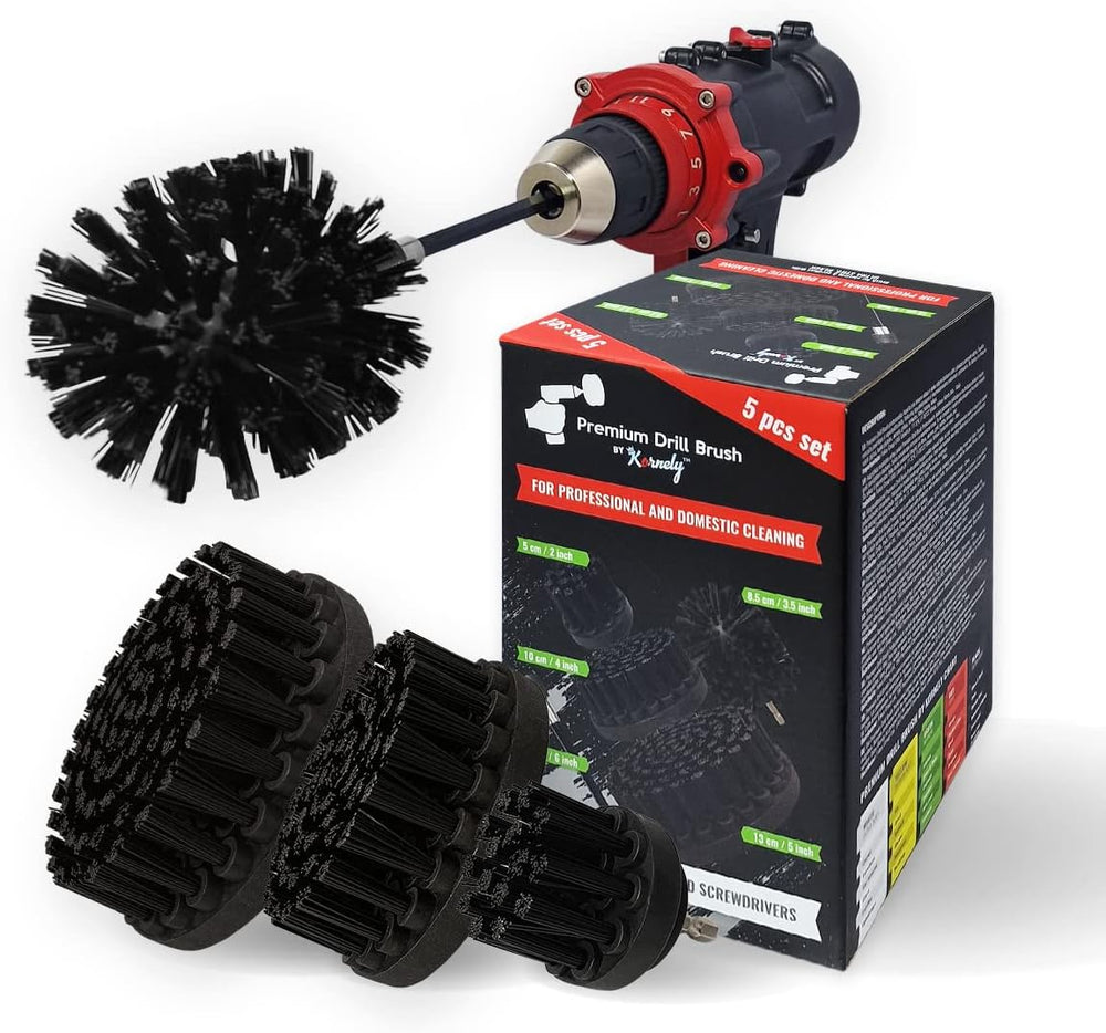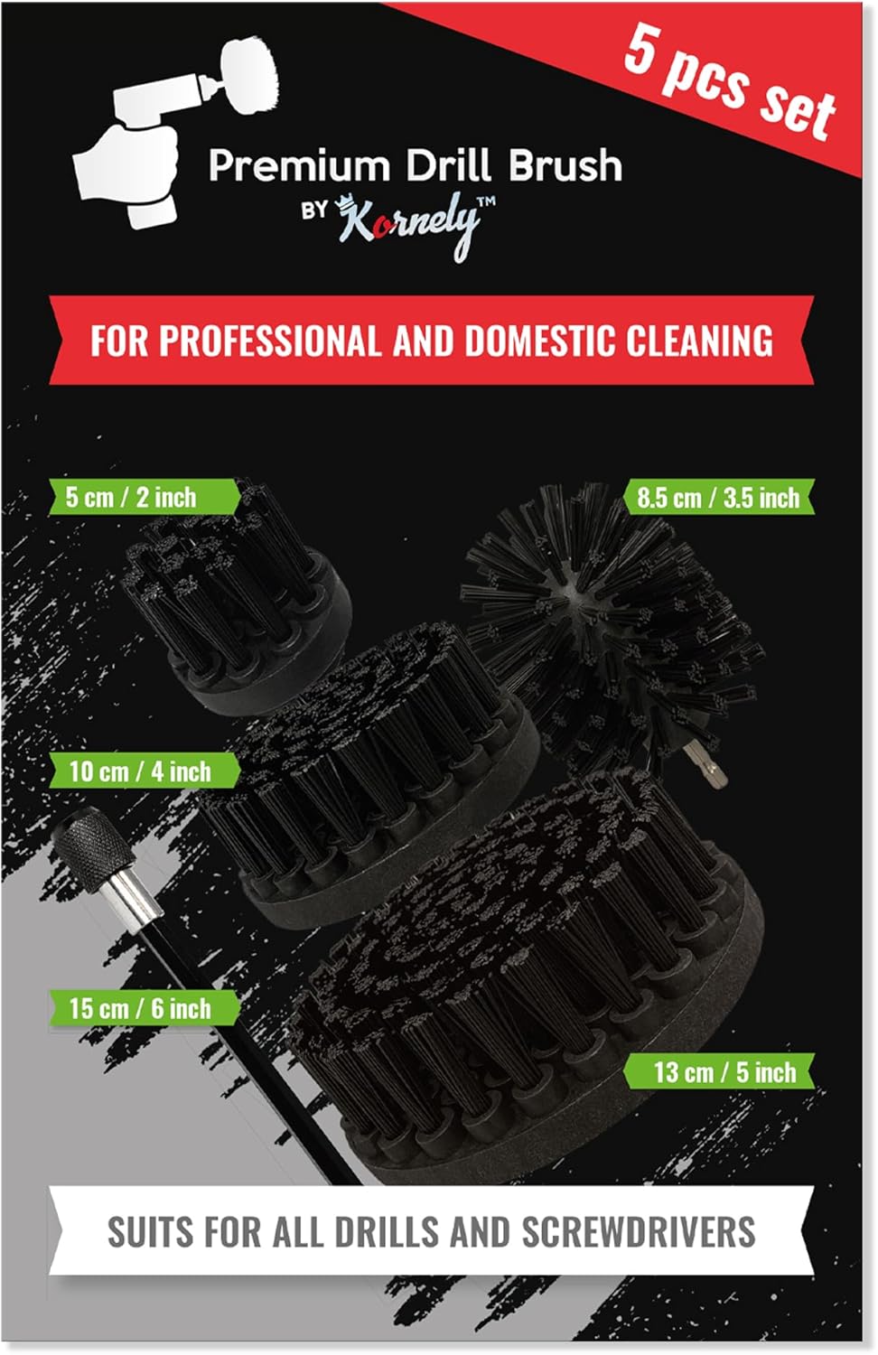 KKornely Premium Drill Brush gives professionals a fast way to cut through the toughest industrial grime. Ultra-stiff nylon bristles are set in a rugged polypropylene body and paired with reinforced 6 mm / 8 mm stainless-steel hex shafts that shrug off chemicals and high torque while locking into any standard cordless or corded drill*. This 5-piece kit delivers maximum flexibility: four brush diameters (13 cm, 10 cm, 8.5 cm and 5 cm) handle anything from broad carpet panels to tight grout lines, while the 15 cm extension reaches deep wheel wells, engine bays or under furniture without straining your wrist. The double-density design packs twice as many bristles per tuft as ordinary heads, blasting through cement slurry, rust, soot and baked-on grease without gouging paint or gel-coat. Choose the size that suits your task—stripping mortar from brick joints, descaling barbecue grates, sanding concrete patios, removing algae from stone steps, cleaning heavy equipment or restoring historic masonry. Jobs that once took hours by hand finish up to ten times faster, slashing labour and fatigue. Quality is verified batch-by-batch by Kornely engineers in Europe to ensure consistent density, balance and durability. Our EU support team answers within 24 hours, and business buyers can obtain a VAT invoice for every purchase. Select Kornely for premium construction, proven performance and service you can trust. Drill not included.