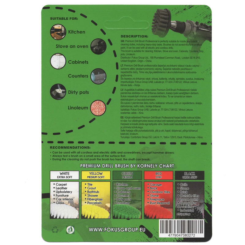 Kornely Premium drill brush converts any household drill into a high-RPM cleaning brush that removes grime up to ten times faster than hand-scrubbing. Each head is moulded from impact-proof polypropylene, packed with double-density nylon and fixed to a stainless 8 mm hex shaft that clicks straight into cordless or corded chucks. The result is a wobble-free scrubber that out-cleans a wire brush yet never scratches paint, glass or stone.