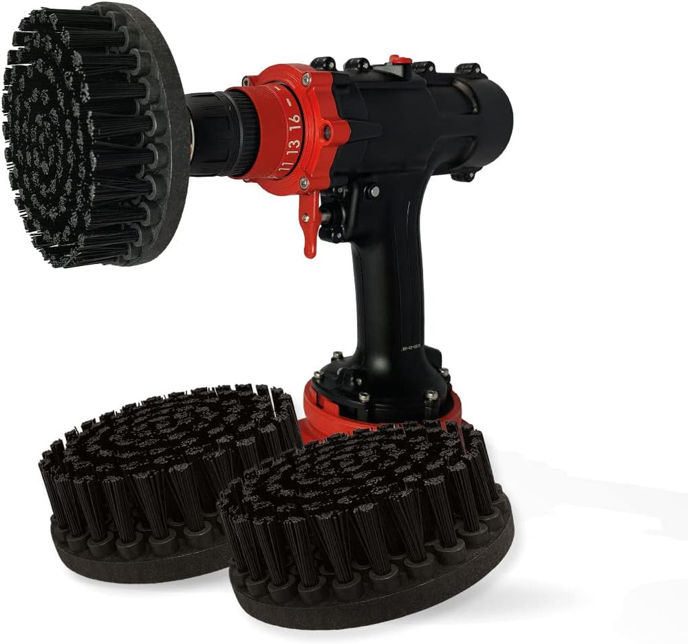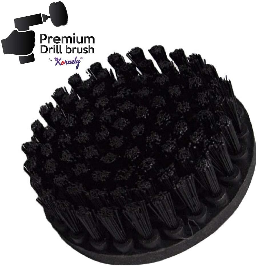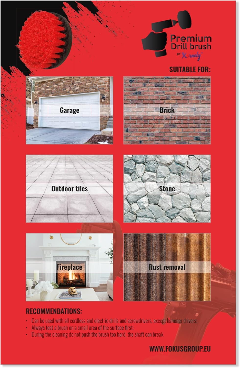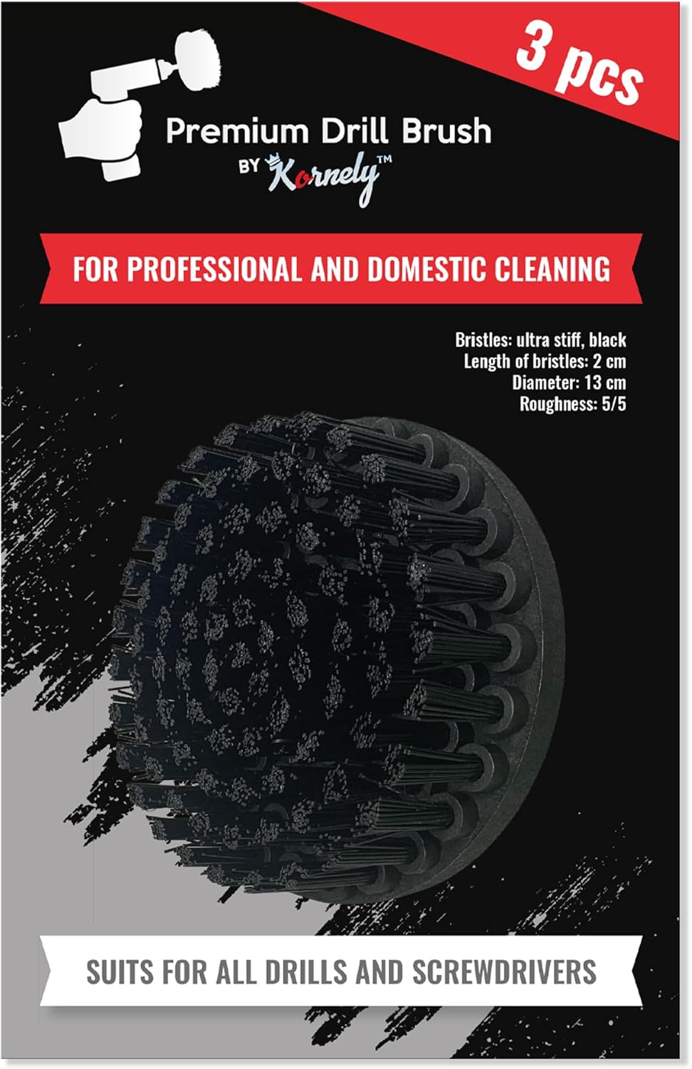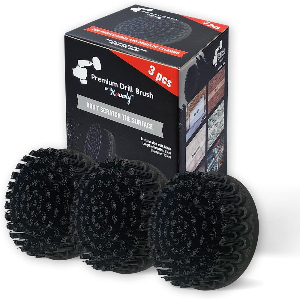 Kornely Premium Drill Brush transforms any standard household drill into a heavy-duty cleaning machine, removing built-up grime and debris up to ten times faster than hand-scrubbing. Each brush head is moulded from reinforced polypropylene, densely packed with industrial-grade ultra-stiff nylon bristles, and secured to a stainless 8 mm hex shaft for wobble-free power transfer. Built to handle the toughest jobs, it delivers unmatched durability and performance on surfaces wire brushes would scratch or destroy. The ultra-stiff black variant is engineered for demanding applications: stripping moss from driveways, removing algae from stone walls, clearing rust from metal tools, scrubbing concrete floors, cleaning BBQ grills, degreasing industrial equipment, and restoring construction tools. Indoors or out, it tackles masonry, brickwork, garage floors, and heavy-duty patio cleaning with ease. This three-brush pack keeps fresh heads ready: dedicate one to concrete and masonry, one to rusted steel and grills, and one to chimneys, garage floors, or industrial tools to prevent cross-contamination and extend bristle life. Every production run is EU-tested by Kornely engineers to guarantee bristle retention, balance, and resistance to wear and chemicals. Our Pro Support team replies within 24 hours, offers expert cleaning advice, handles hassle-free returns, and issues VAT invoices for business customers. Select Kornely for premium construction, proven heavy-duty performance, and service you can trust.